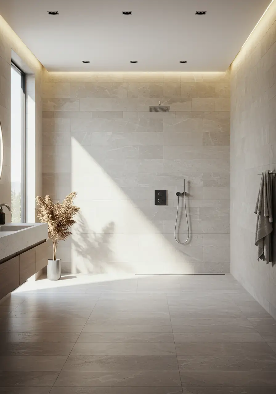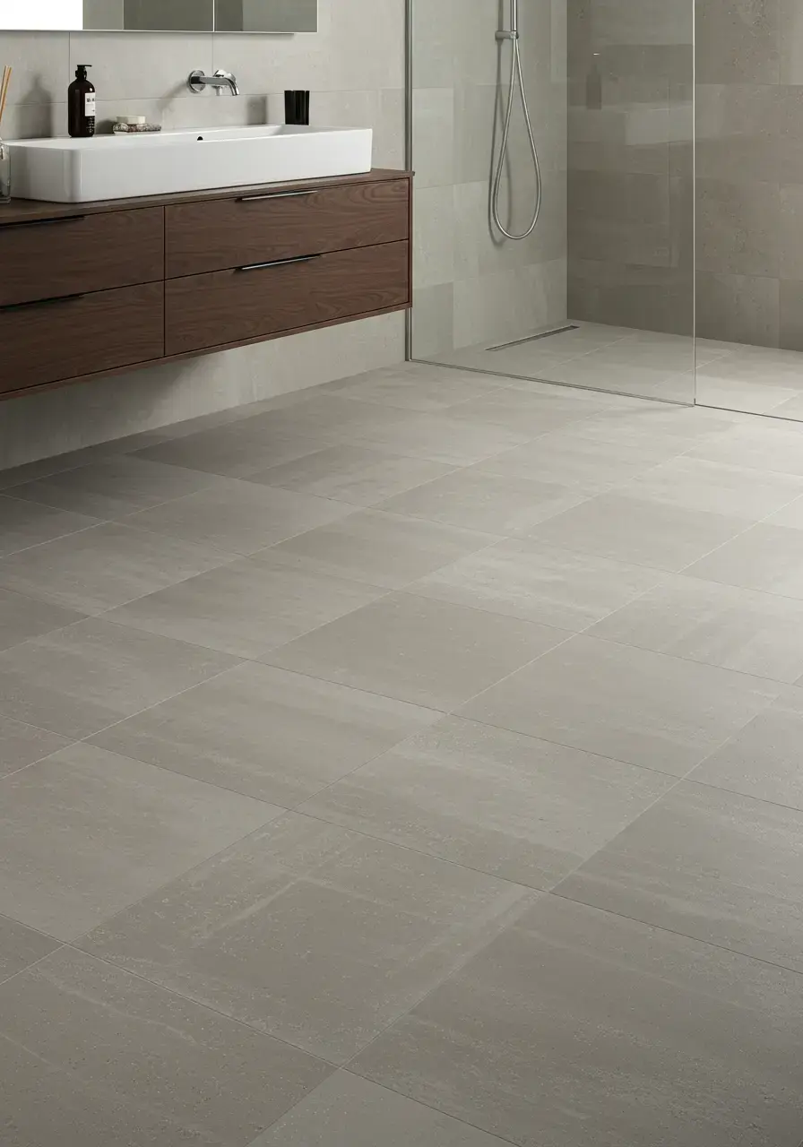 Large format tiles minimize grout lines, creating a clean, seamless, and visually expansive floor that enhances the contemporary aesthetic.