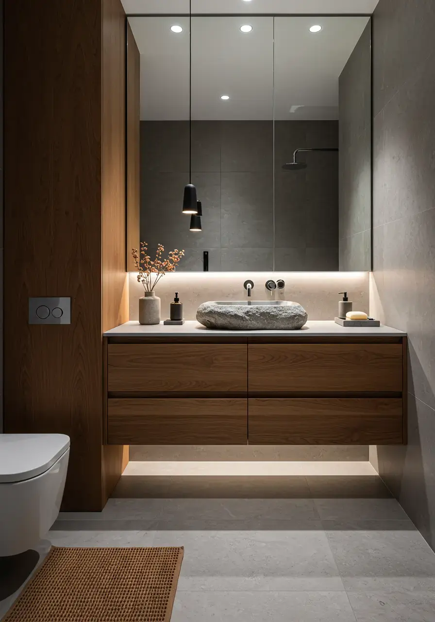 Adding natural materials beautiful balances the sleekness of contemporary design. Wood, stone, or even concrete bring warmth, texture, and a sense of grounding. I love how a simple wooden stool or a concrete sink can add so much character to a modern space.