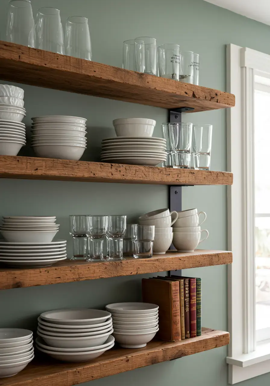 • Style them with frequently used dishes, mixing bowls, and decorative items like small plants or vintage scales.