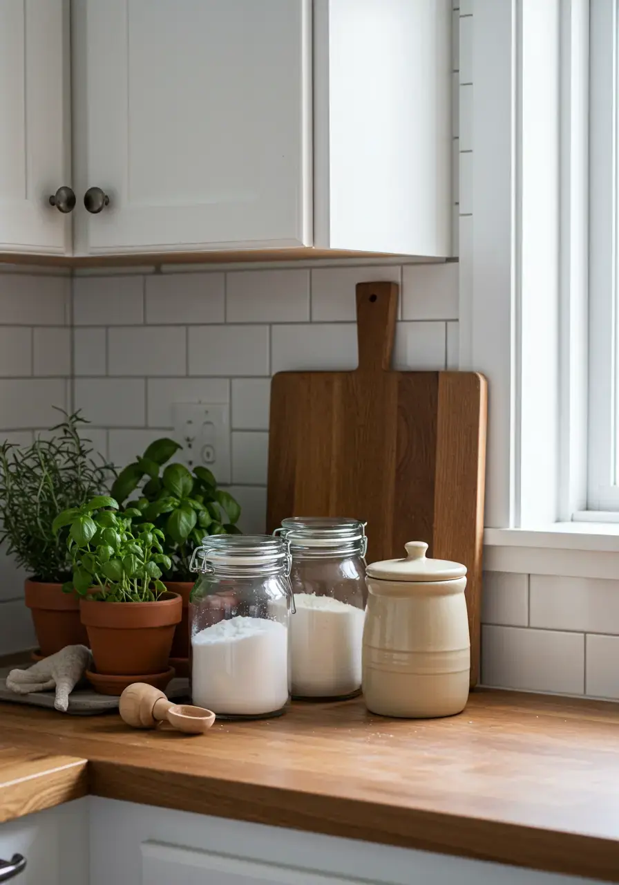 Finally, don’t forget the finishing touches! How you style your countertops really pulls the whole look together. Think functional beauty – a pretty fruit bowl, a wooden cutting board left out, a collection of herb pots, or a vintage bread box. These small details add charm and make the space feel lived-in and loved. I always keep a wooden cutting board out; it just adds that rustic touch.