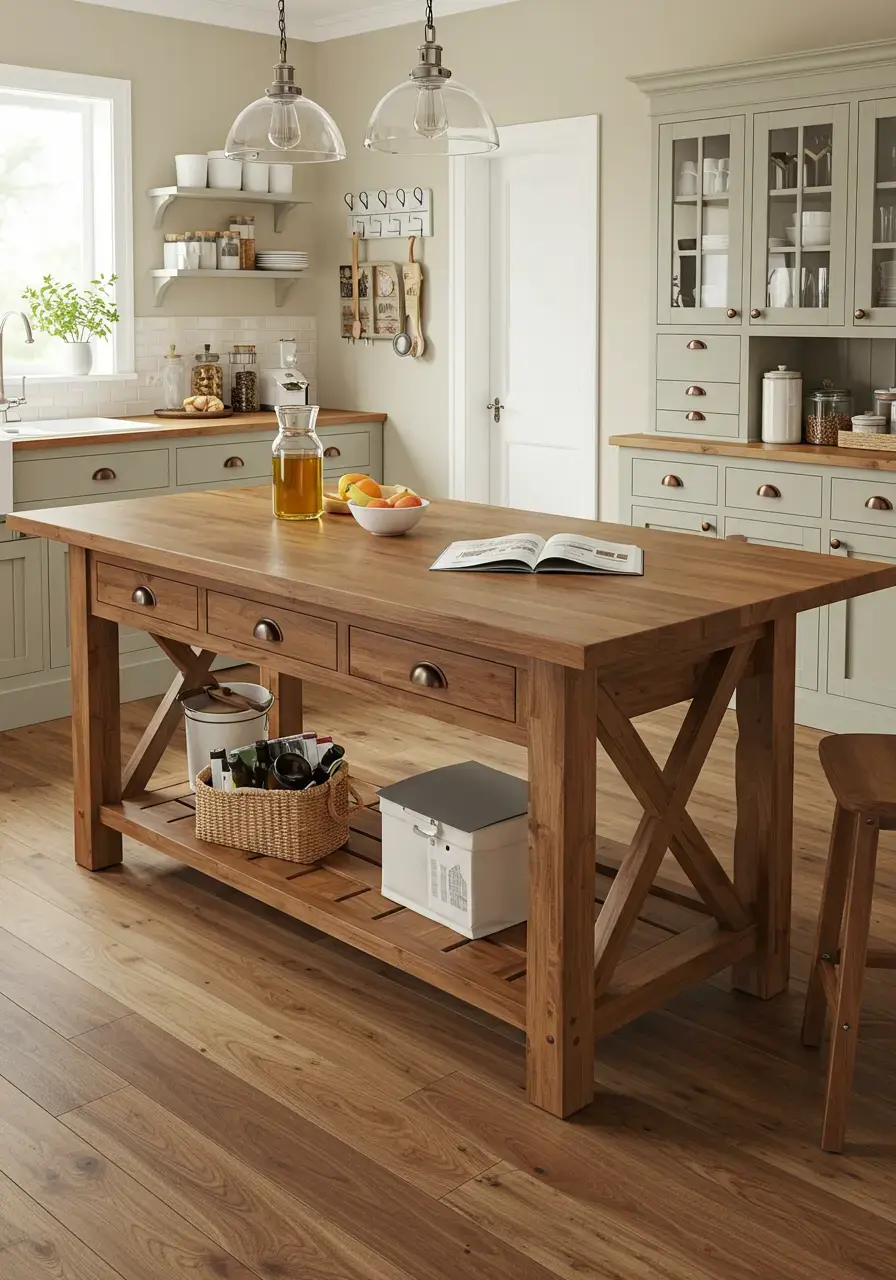 Who says an island has to be a built-in structure? A sturdy farmhouse table in the center of your kitchen can serve as a fantastic island alternative. It provides workspace and a casual spot for family to gather while you cook. This is a great option for smaller kitchens or if you want a more relaxed, less ‘fitted’ feel. My large wooden table is where we seem to do everything!