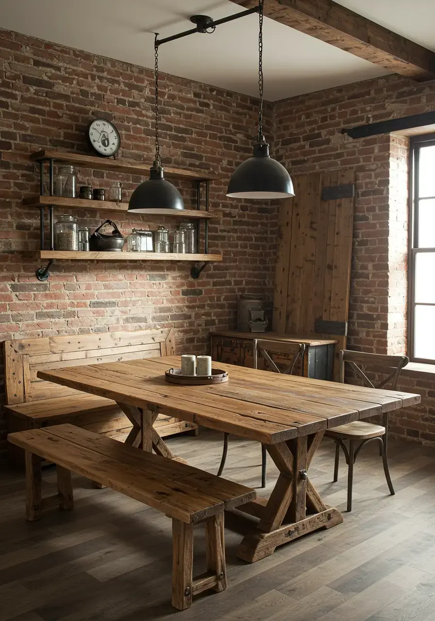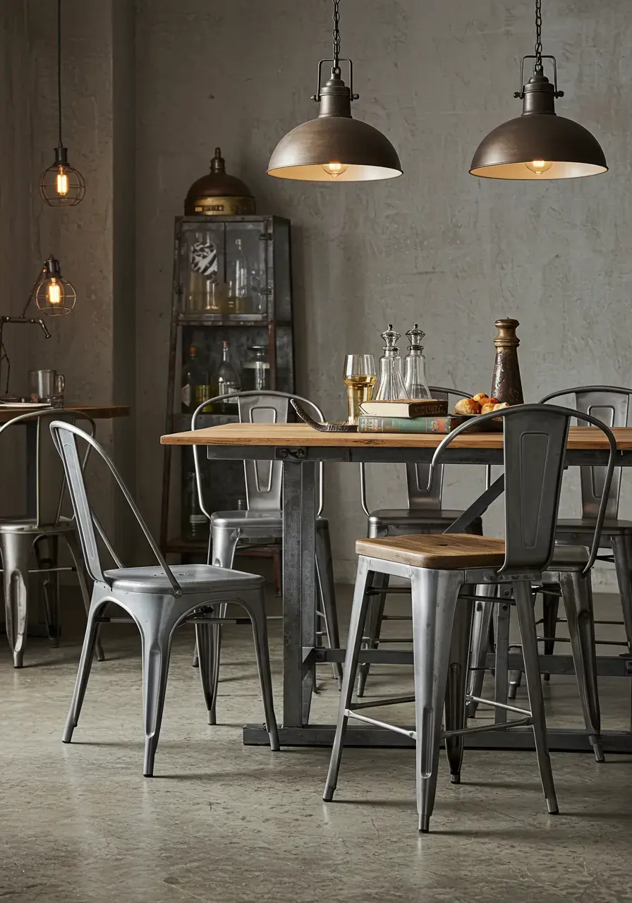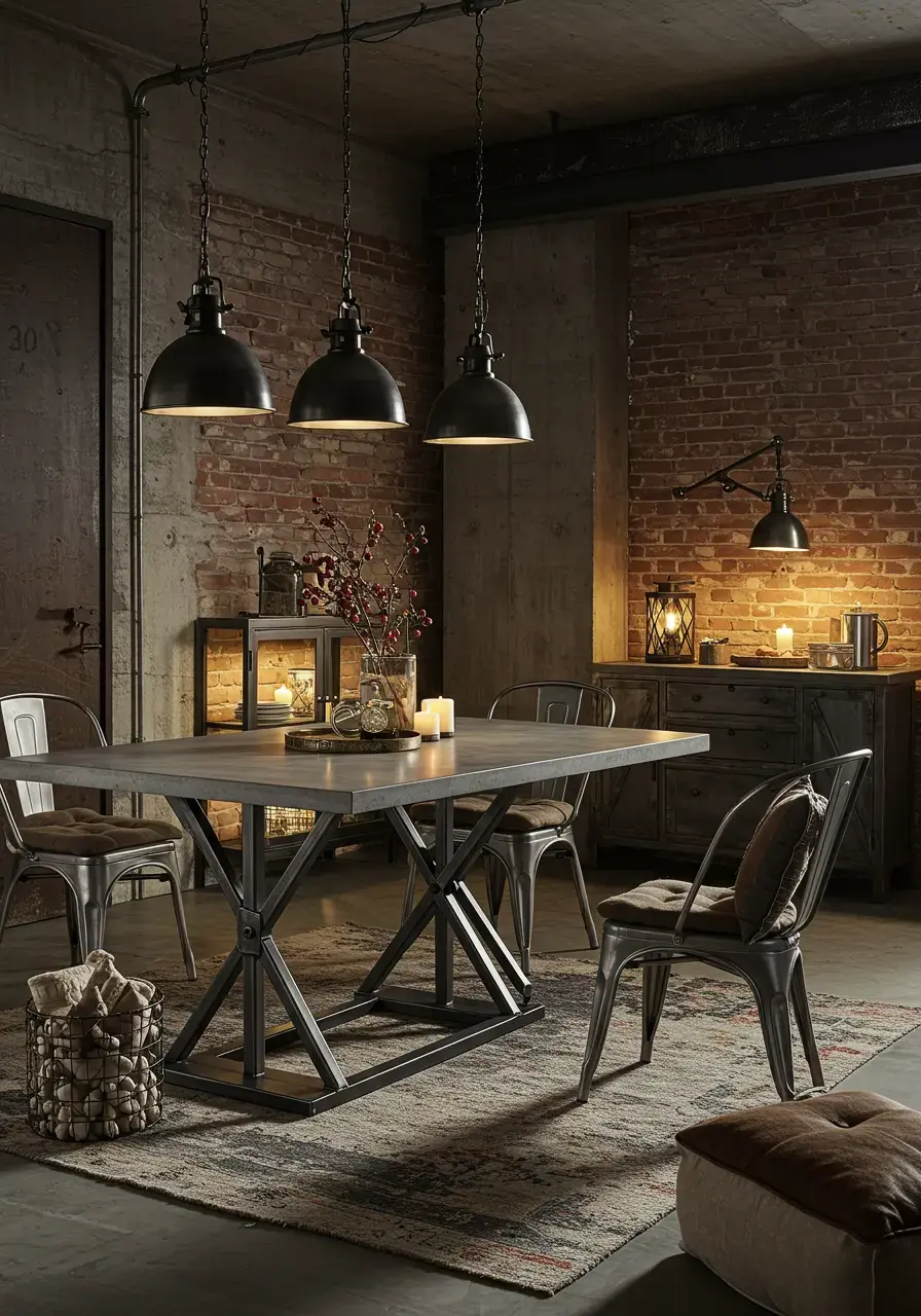 Lighting is key! Industrial style often features pendant lights with exposed bulbs or metal shades. They hang low, creating a more intimate and focused light over the dining table. It’s like bringing a piece of a factory or workshop into your home, but in a super stylish way.