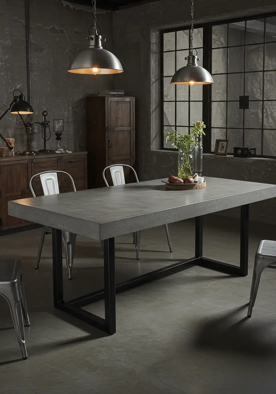 Concrete is a core material in industrial settings. Using it for a tabletop introduces strength, weight, and a raw, unfinished texture that defines the style.