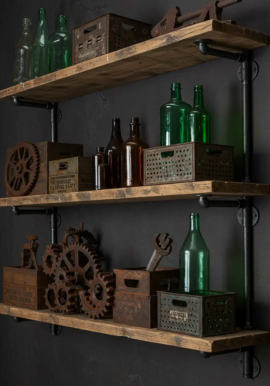 Industrial style celebrates function and salvaged items. Style open shelving with things that look like they could have been found in an old factory or workshop – gears, metal crates, vintage bottles, or old tools. It tells a visual story about utility and history.