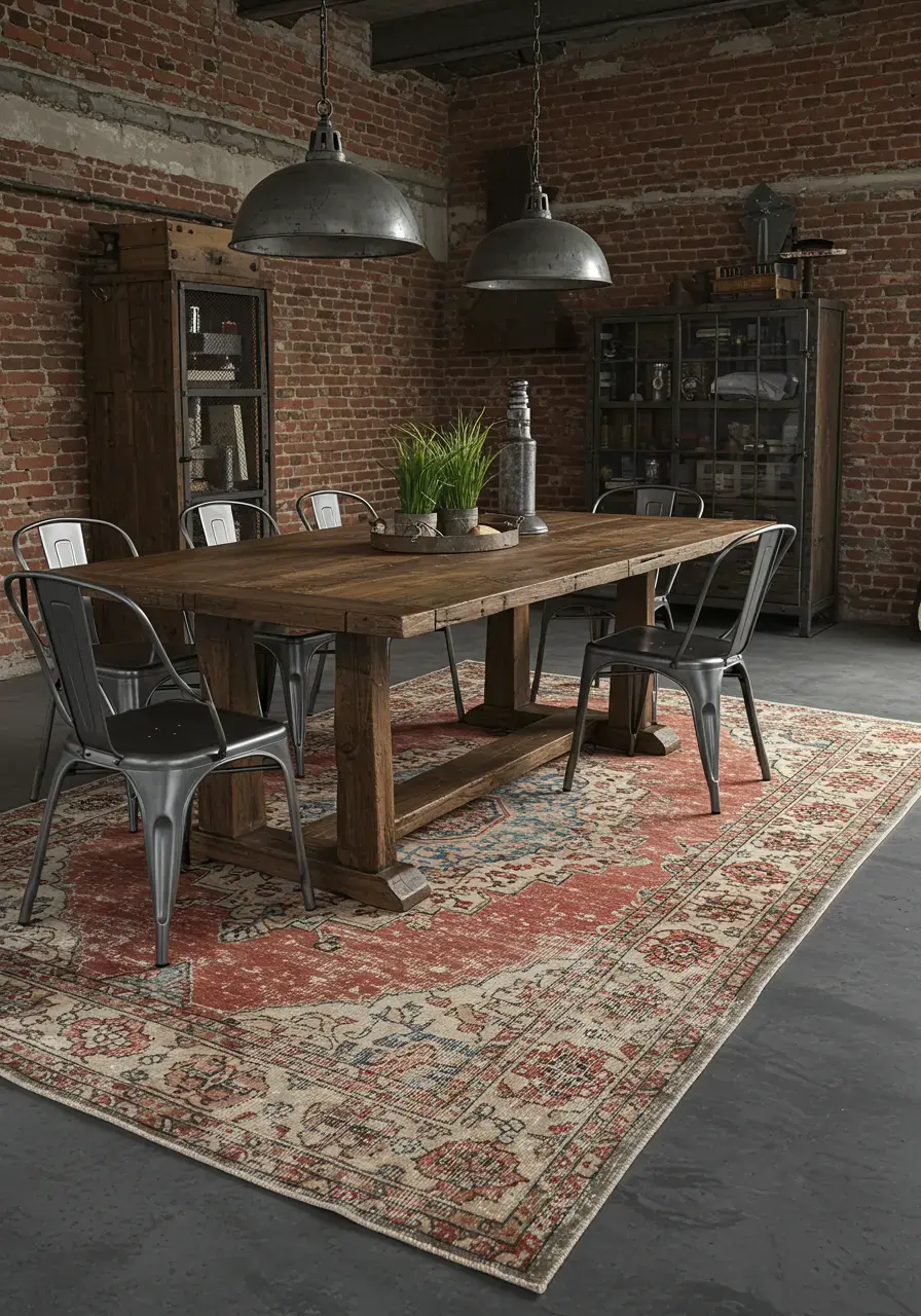 A vintage or distressed area rug can soften the hard edges of an industrial dining room and add a layer of comfort and color. Look for rugs with worn patterns or muted colors that complement the overall palette. It feels lived-in and cozy.